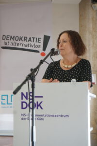 Claudia Wörmann, Co-Vorsitzende des Vereins EL-DE-Haus begrüßt die Diskutierenden und zahlreiche Zuhörer*innen (Foto: HB)
