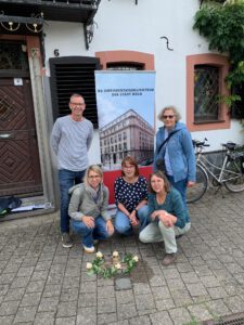 Nach der Verlegung wurde uns als Patinnen und Paten der Stolpersteine ein Besuch der Familie für den 26. Juli angekündigt. Peter Goodman, der Sohn von Erich, und Steve Coret, der Sohn von Helene Gutmann kamen mit Kindern und Enkelkindern nach Köln, um die Stolpersteine zu sehen und an ihre Großeltern zu erinnern. Pünktlich um 15 Uhr erwartete ich mit Petra Pluwatsch, die über die Stolpersteine geforscht und veröffentlicht hat, die Gäste. Peter brachte ein Plakat mit Fotos seiner Familie mit und erklärte uns die Zusammenhänge. Dr. Michael Rado vom Vorstand der Synagogengemeinde und ich im Namen der Paten begrüßten die Familien. Peter hatte auch ein Backbuch seines Großvaters mit Rezepten mitgebracht. Er war dann später etwas enttäuscht, dass es kaum noch klassische Bäckereien bei uns gibt.