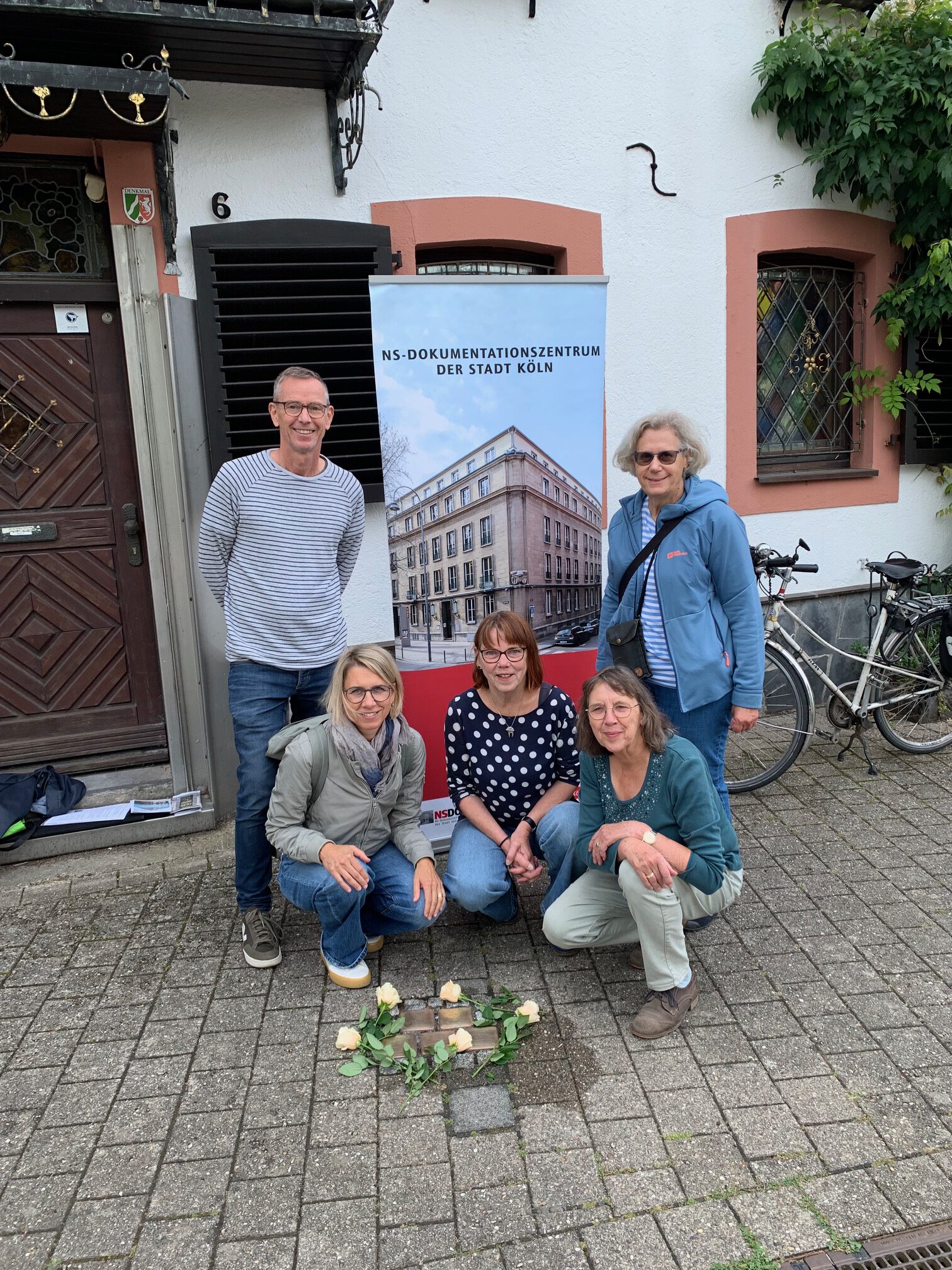Irmgard legt 5 weiße Rosen um die Steine. Eine Frauengruppe kommt dazu, sie treffen sich jedes Jahr einmal in der Groov, um von hier aus zum Dom zu „pilgern“. Sie kennen Stolpersteine, interessieren sich für die Menschen „hinter den Steinen“ und erzählen uns vom ausgelöschten jüdischen Leben in ihrer Region, sie kommen aus Mondorf/Troisdorf.