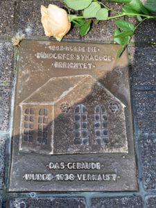 1951 wurde der Besitz an die Erben der Salomons zurückerstattet und dann von den Erben an die Familie Burgwinkel verkauft. Der Nachfahre Hans Burgwinkel recherchiert und pflegt die Erinnerung an die jüdische Geschichte, öffnet hin und wieder sein Haus für Besucher*innen, denn das Grundstück grenzt an die Rückseite des Hauses, das ehemals die Synagoge von Zündorf war. – Seine Informationen sind im Internet unter „Poller Heimatmuseum“ zu finden. – Das erfahren wir u.a. durch eine Mieterin des Hauses, die natürlich Hans Burgwinkel und dadurch die Geschichte ihres Hauses kennt und die den Stein pflegt.